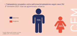 Por otro lado, el 28% de las mujeres ocupa cargos de mayor jerarquía dentro del mercado laboral. Esta desigualdad se relaciona con la segregación vertical del mercado de trabajo. También podemos relacionarlo con el mayor peso que tienen las tareas domésticas y de cuidado, que afectan el desarrollo de su carrera laboral.