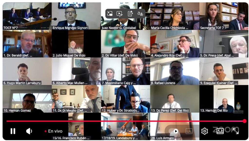 Los jueces Méndez Signori, Fernando Canero y Germán Castelli se conectaron desde una sala de audiencias del Palacio de Justicia, en Talcahuano 550, donde minutos antes se permitió el ingreso de reporteros gráficos para registrar imágenes del inicio del proceso.