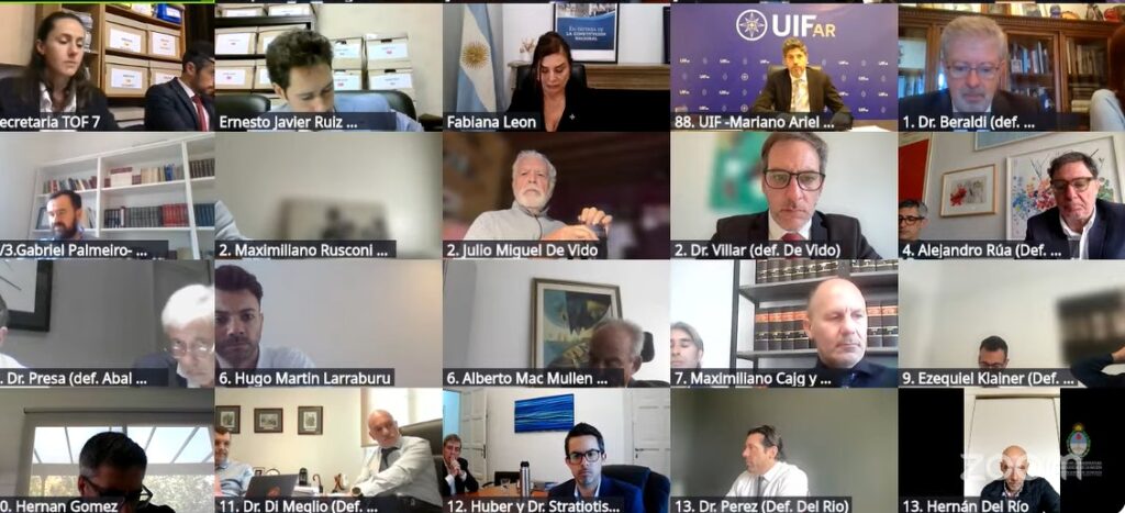 A poco de comenzar la lectura del requerimiento de elevación a juicio de la fiscalía, Méndez Signori interrumpió a la secretaria del Tribunal para advertir que «no todos los imputados aparecen en cámara. El Tribunal debe velar por la presencia de todos, les pido a las personas que no aparecen en cámara que lo hagan y arbitren las medidas necesarias para que yo los pueda ver”, indicó.Poco ante se había constatado la presencia de los 87 acusados y sus defensas en la sala virtual. También la de la fiscal de juicio Fabiana León, conectada desde su despacho en Comodoro PY 2002 y de la querella de la Unidad de Información Financiera (UIF).
