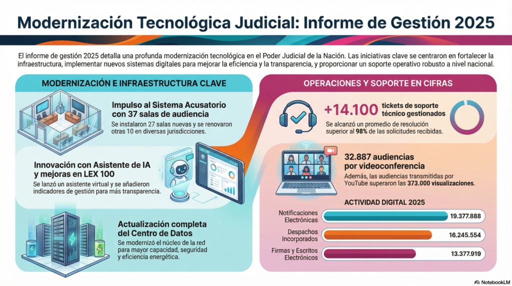 Durante 2025, el Consejo de la Magistratura de la Nación profundizó un proceso de modernización tecnológica sin precedentes en el Poder Judicial. A través del trabajo de la Dirección General de Tecnología, el organismo avanzó en la implementación del sistema acusatorio, la digitalización de procesos clave y el fortalecimiento de la infraestructura crítica, con impacto directo en la transparencia, la eficiencia operativa y el acceso a la justicia.