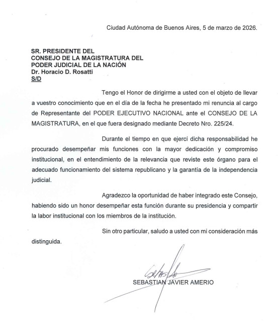 “Tengo el honor de dirigirme a usted con el objeto de llevar a vuestro conocimiento que en el día de la fecha he presentado mi renuncia al cargo de representante del Poder Ejecutivo Nacional ante el Consejo de la Magistratura”, expresó Amerio en la nota enviada este jueves 5 de marzo al titular del órgano encargado de la selección y disciplina de los jueces.